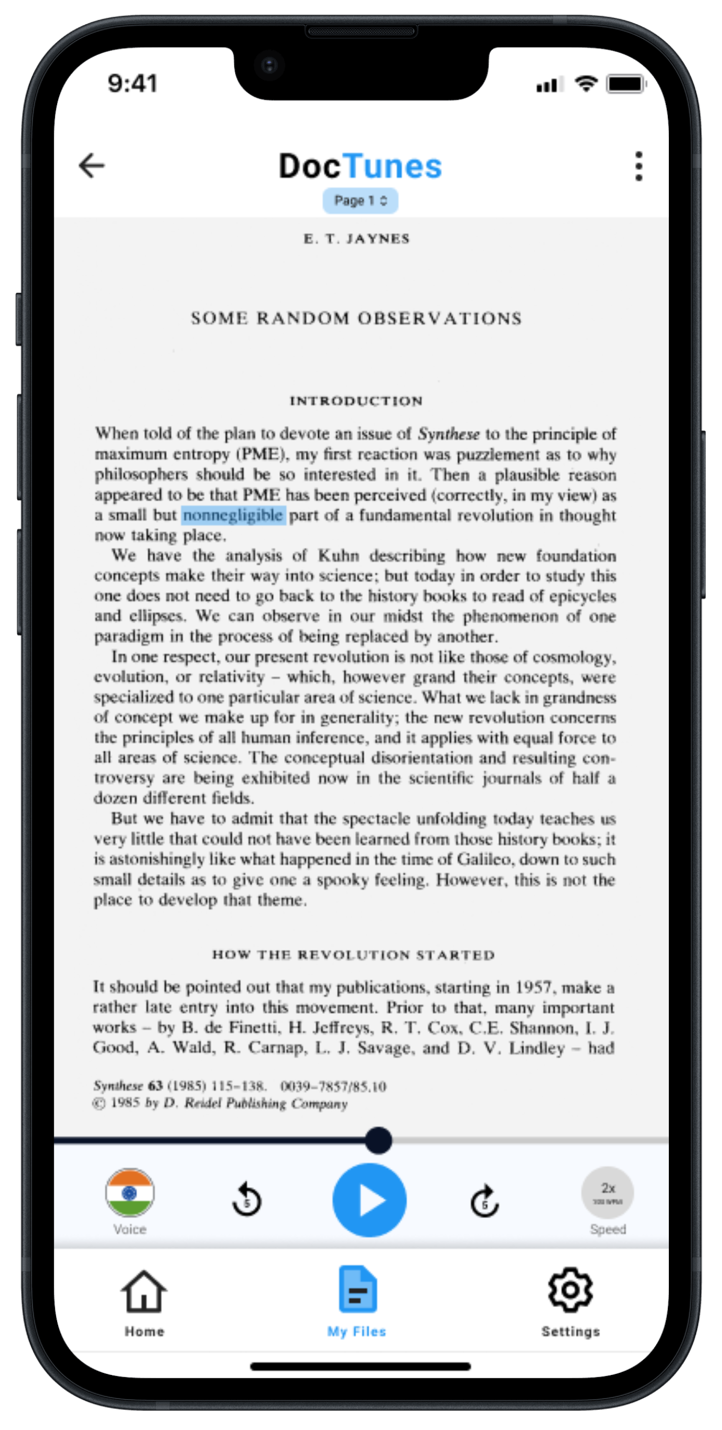 Set your preferred playback settings with DocTunes. Users are able to change speed, voice and even pitch of the voice for their comfortability while hearing with DocTunes.